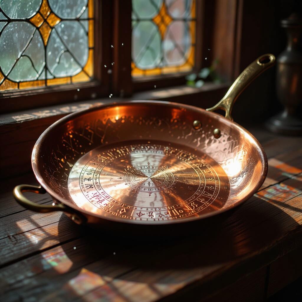 From a nearby shelf, the dwarf retrieved a gleaming pan, etched with ancient symbols and shimmering with magical energy. Jacob’s breath caught in his throat as he marveled at the artifact’s beauty. This was some sturdy magic indeed, and old.